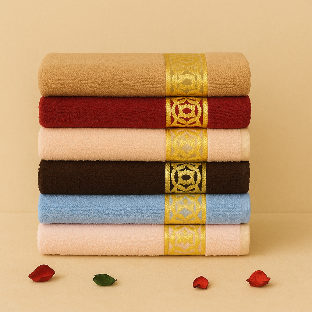 Chaque serviette est soigneusement tissée en 100 % coton doux et absorbant, agrémentée d’une bande satinée dorée qui lui confère une touche noble et lumineuse.