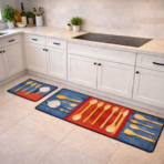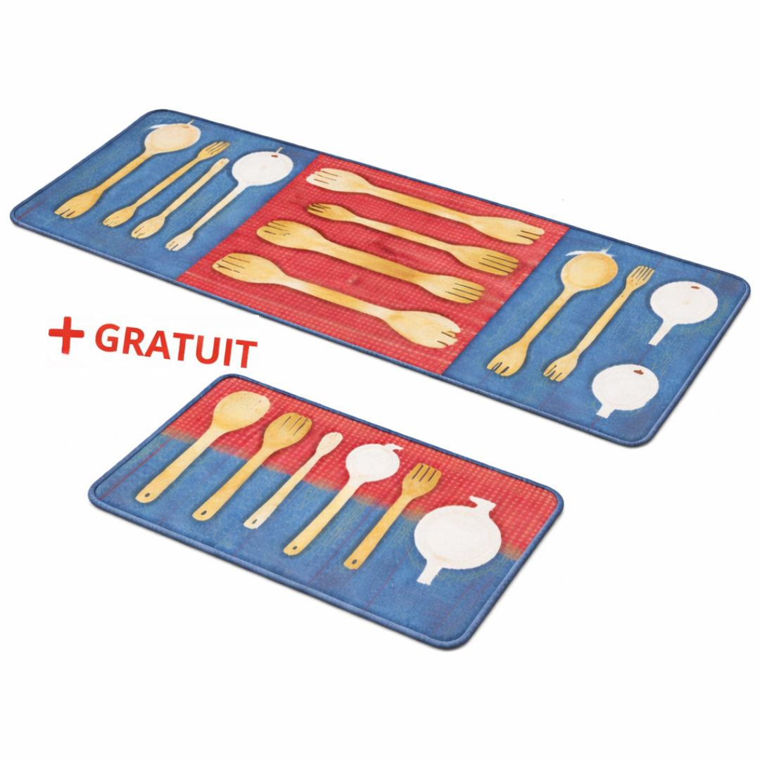 Ajoutez une touche originale et colorée à votre cuisine avec ce superbe set de 2 tapis cuisine au design moderne. Son motif ustensiles de cuisine sur fond effet bois bleu et rouge apporte une décoration dynamique et chaleureuse, idéale pour donner du caractère à votre espace.