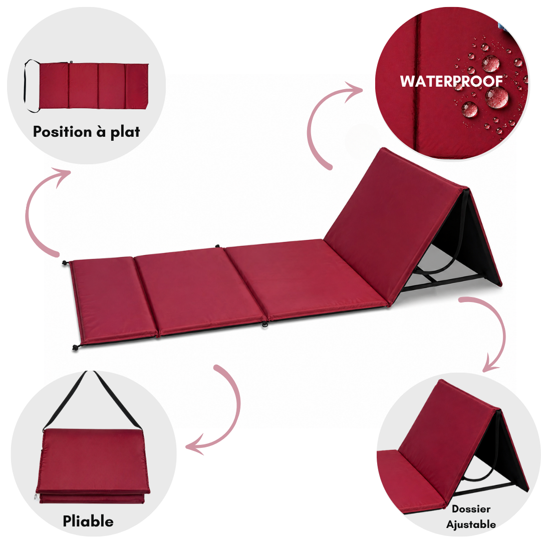 Offrez-vous un moment de détente absolu avec ce tapis de plage pliable alliant confort, praticité et élégance. Doté d’un dossier réglable, il vous permet de profiter d’une position idéale pour lire, bronzer ou simplement vous relaxer en toute sérénité. Sa matière imperméable (waterproof) empêche l’eau de pénétrer, gardant le tapis sec même sur sol humide, tandis que son entretien facile vous permet de le nettoyer rapidement après chaque utilisation.