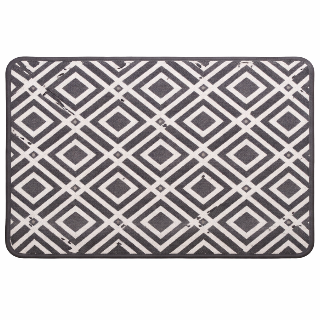 Apportez une touche contemporaine à votre intérieur avec ce tapis 44×70 cm au motif géométrique en losanges. Son mélange élégant de gris et blanc s’adapte facilement à tous les styles de décoration (moderne, minimaliste, scandinave). Idéal pour la cuisine, l’entrée ou devant un évier, il offre un rendu chic tout en protégeant le sol au quotidien. Sa finition bordée assure une bonne tenue et une meilleure durabilité.
